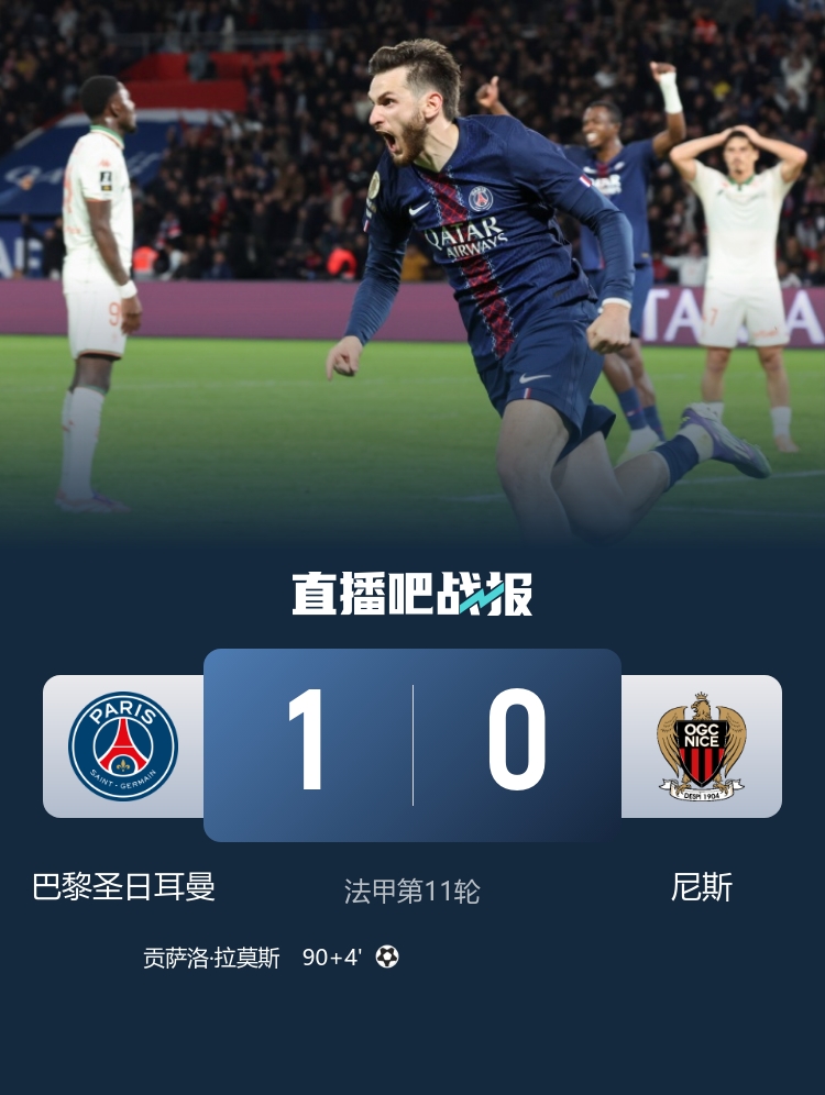 贡萨洛-拉莫斯补时绝杀,巴黎1-0打败尼斯,本轮巴黎先赛暂4分上风领跑。