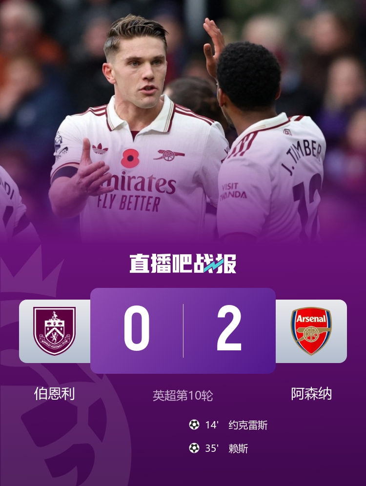 阿森纳客场2-0伯恩利,联赛5连胜7分领跑。枪手豪取各项赛事9连胜,各项赛事络续7场零封。