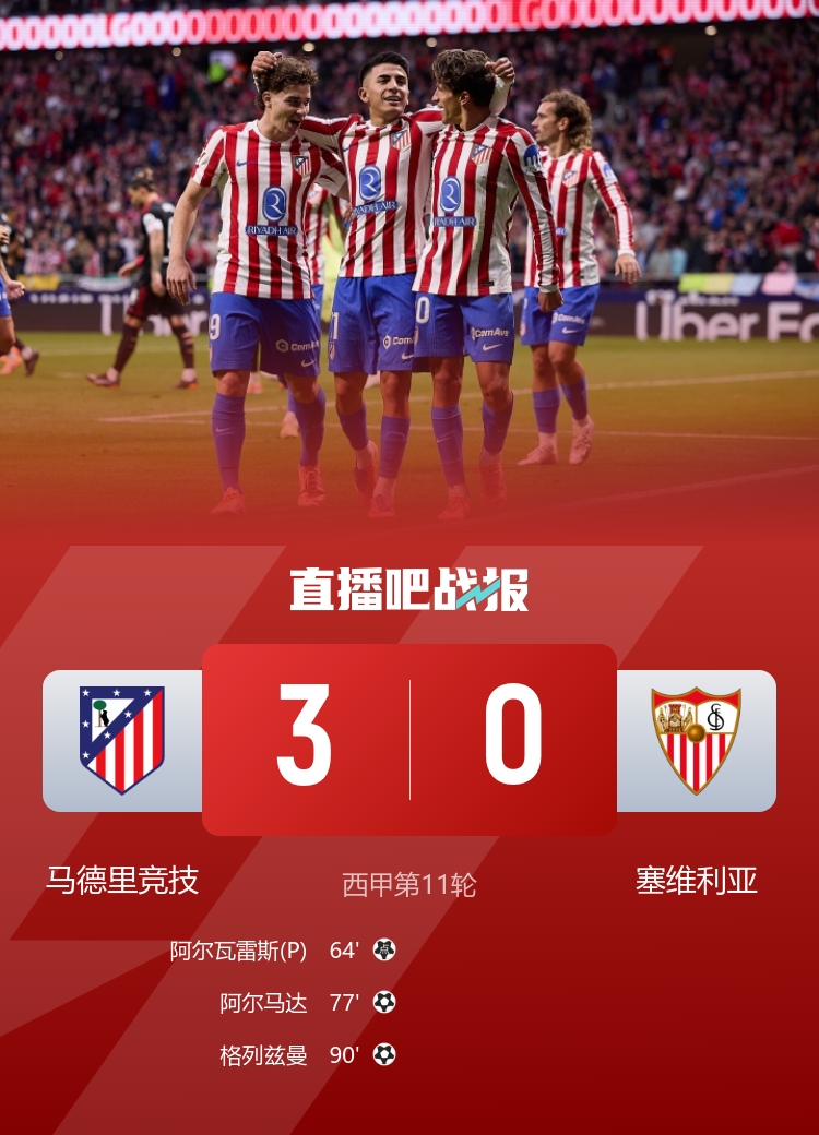 阿尔瓦雷斯点球掷中,阿尔马达破门,格列兹曼立功。最终马德里竞技3-0打败塞维利亚。