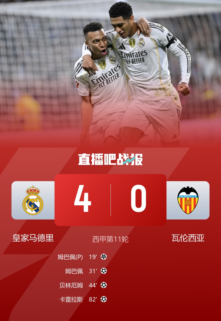 姆巴佩双响,A费全国波打进个东谈主皇马生活首球。最终皇马4-0瓦伦西亚,各项赛事六连胜,7分领跑积分榜。