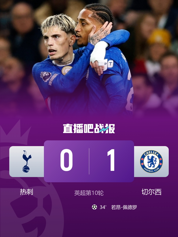 佩德罗失单刀后破门,切尔西1-0热刺,对后者五连胜,升入前四距榜首8分。