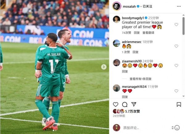萨拉赫社媒晒赛场照,球迷褒贬:英超历史最好!