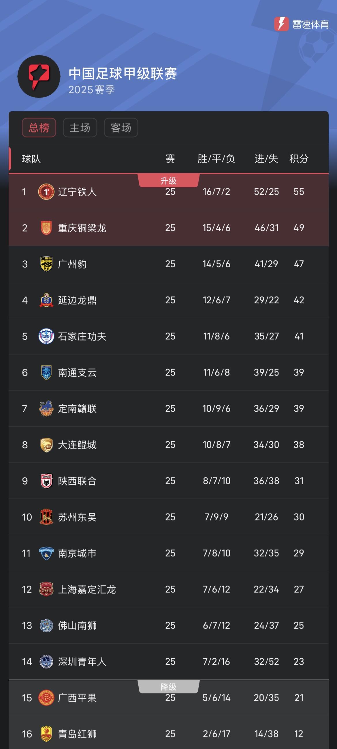 雷速体育10月5日讯 今晚,中甲第25轮比赛系数铁心,中甲前三辽宁铁东说念主、重庆铜梁龙、广州豹均收成得手。