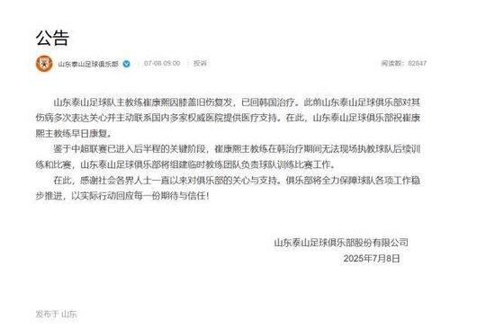 北京时代7月8日,山东泰山足球俱乐部发布官方公告: 主西席崔康熙膝盖旧伤复发已回韩国调整,将组建临时西席团队崇敬闇练比赛。 [官方公告] 山东泰山足球队主西席崔康熙因膝盖旧伤复发,已回韩国调整。此前山东泰山足球俱乐部对其伤病屡次抒发暖和并主动干系国内多家巨擘病院提供医疗撑抓。在此,山东泰山足球俱乐部祝崔康熙主西席早日康复。 鉴于中超联赛已参加后半程的关节阶段,崔康熙主西席在韩调整技巧无法现场执教球队后续闇练和比赛,山东泰山足球俱乐部将组建临时西席团队崇敬球队闇练比赛职责。 在......查看更多